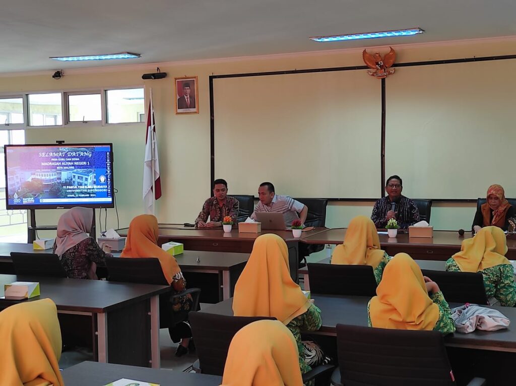 Kamis, 22 Februari 2024 Fakultas Ilmu Budaya menerima kunjungan dari MAN 1 Kota Malang di Ruang Seminar Gedung D. Kegiatan kunjungan ini diterima langsung oleh Prof. Dr. Alamsyah, S.S., M.Hum. selaku Dekan Fakultas Ilmu Budaya, Fajrul Falah, S.S., M.Hum. selaku Staff Ahli Wakil Dekan Akademik dan Kemahasiswaan, dan Endang Purwaningsih, S.Si. selaku Supervisor Akademik dan Kemahasiswaan