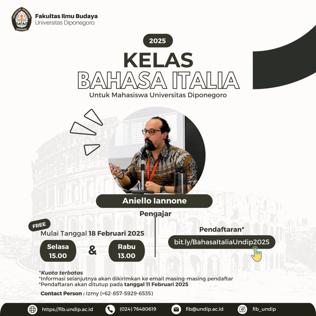 Fakultas Ilmu Budaya Universitas Diponegoro membuka pendaftaran kelas Bahasa Italia bagi Mahasiswa Universitas Diponegoro untuk Semester Genap Tahun Akademik 2024/2025. Kelas Bahasa Italia akan dimulai pada tanggal 18 Februari 2025 dan akan dilaksanakan setiap hari Selasa dan Rabu. Kelas Bahasa Italia akan dilakukan secara offline dan tidak menutup kemungkinan secara hybrid.