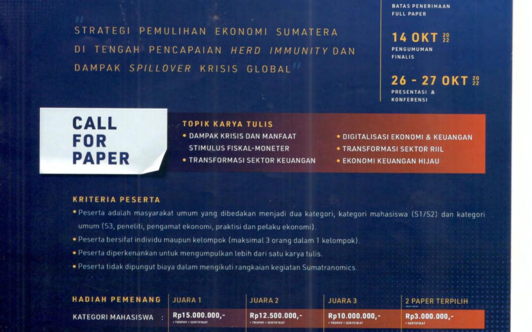 In order to strengthen the advisory function to the Central and Regional Governments, the Bank Indonesia Representative Office for North Sumatra Province held the 3rd Sumatranomics (Sumatra Economic Summit). Sumatranomics is a writing activity that aims to obtain for ideas and solutions as well as new knowledge to seize opportunities and overcome economic problems in Sumatra and North Sumatra. Broadly speaking, the 3rd Sumatranomics activity consists of the phase of screening, webinars, writing workshops, and paper conferences as the highlight of the event which will be held in the fourth quarter of 2022 (complete information can be accessed at www.sumatranomics.com).