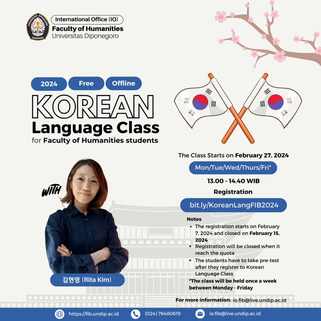 The Faculty of Humanities Universitas Diponegoro opens the application for the Korean Language Class (Even Semester A.Y. 2023/2024) only for Faculty of Humanities Universitas Diponegoro students. The class will be conducted offline and starts on February 27, 2024, between Monday/Tuesday/Wednesday/Thursday/Friday at 1.00 – 2.40 p.m.