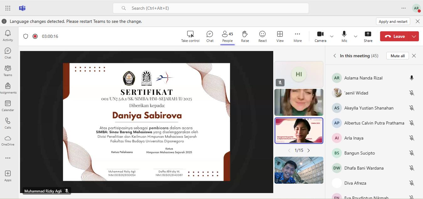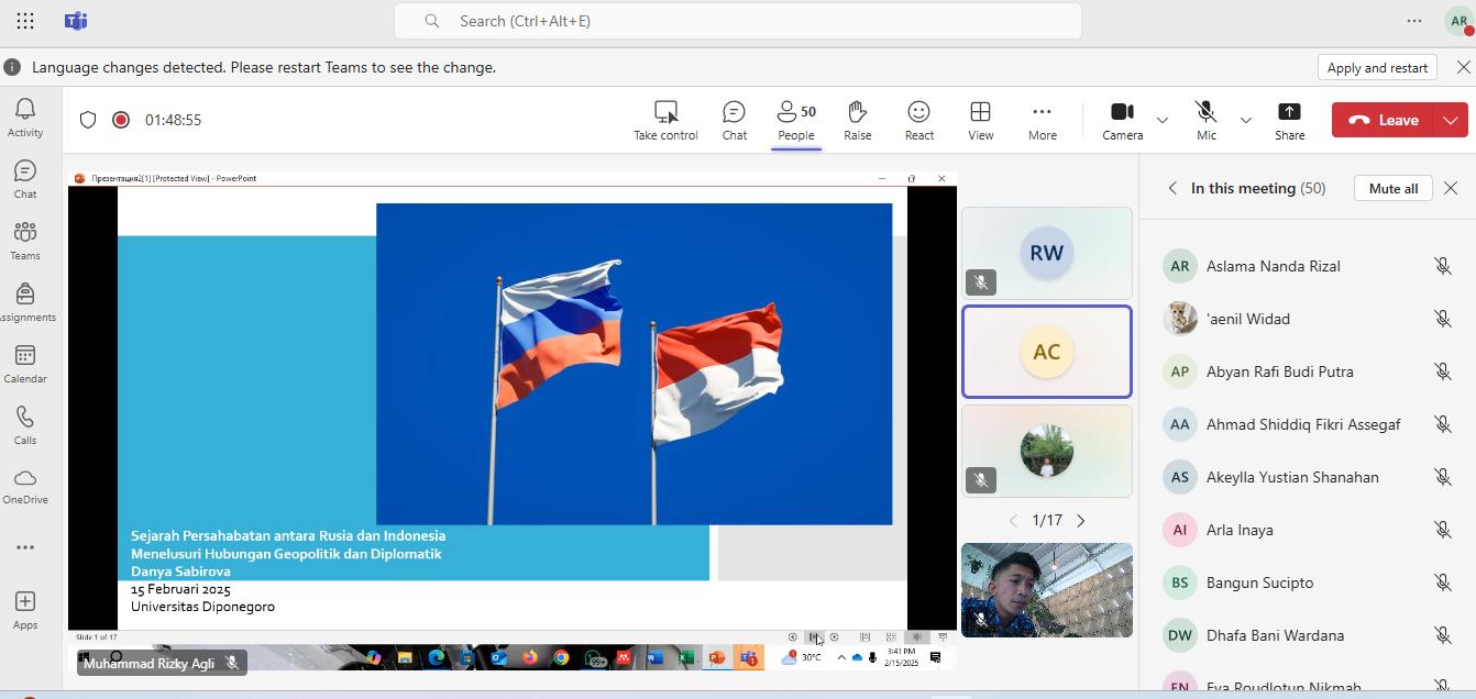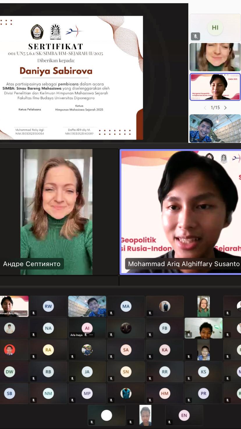 Seminar “Knowing Russian-Indonesian Geopolitics & Diplomacy in History”, with Daniya Sabirova (St. Petersburg University & ORVALA Channel content creator), and HM (Student Association) History FIB Diponegoro University, Saturday, February 15, 2025.
